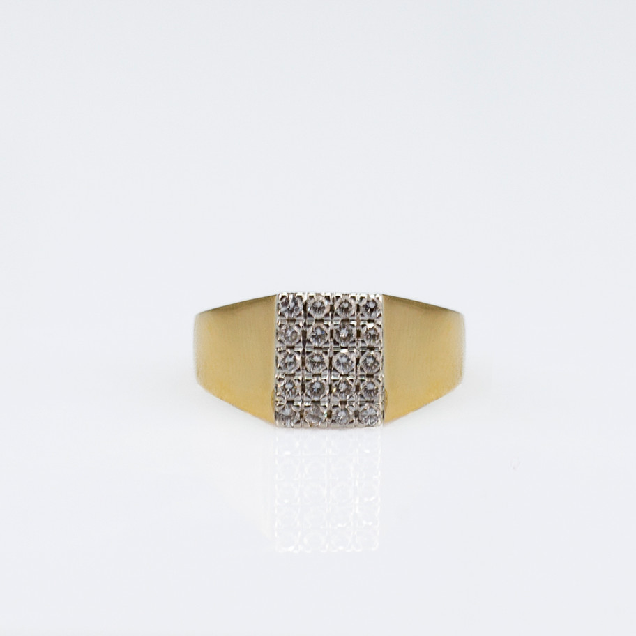 Men's band ring made of 18 kt yellow gold with a central square-shaped motif embellished with brilliant-cut diamonds for a total of 0.20 ct.