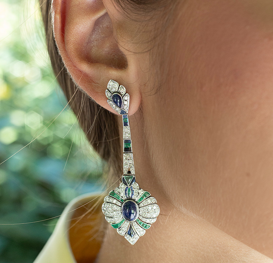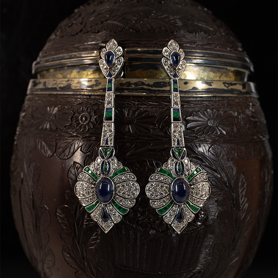 ART DECO' EARRINGS WITH DIAMONDS, SAPPHIRE AND EMERALDS