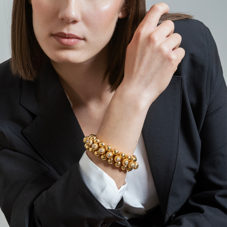 Importante Bracciale in oro giallo 18 kt. con motivi a sfere lucide e lavorate intervallate fra loro. Rifinitura con diamanti taglio brillante carati 1.80 circa . Gioiello dal design originale e di ricercato gusto . Pezzo unico da collezione.