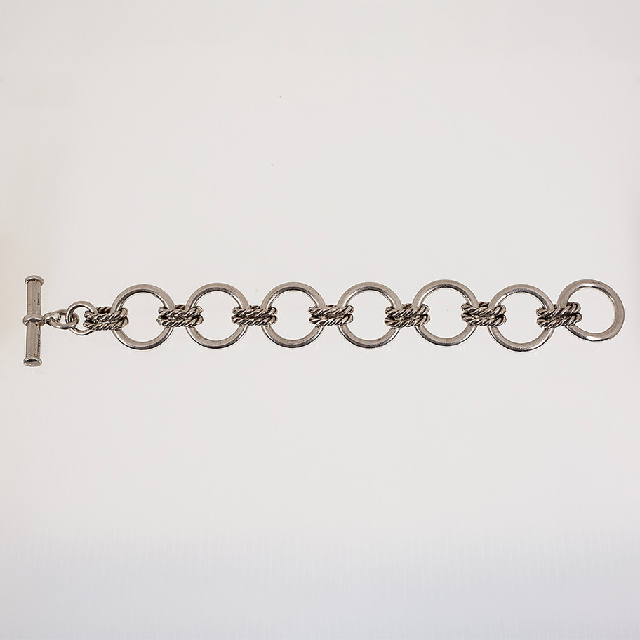 Bracciale vintage in argento massiccio risalente agli anni ’70, composto da sette grandi maglie rotonde intervallate da un elegante motivo a doppia maglia ovale intrecciata. La chiusura è a barra (toggle), in perfetto stile dell’epoca.