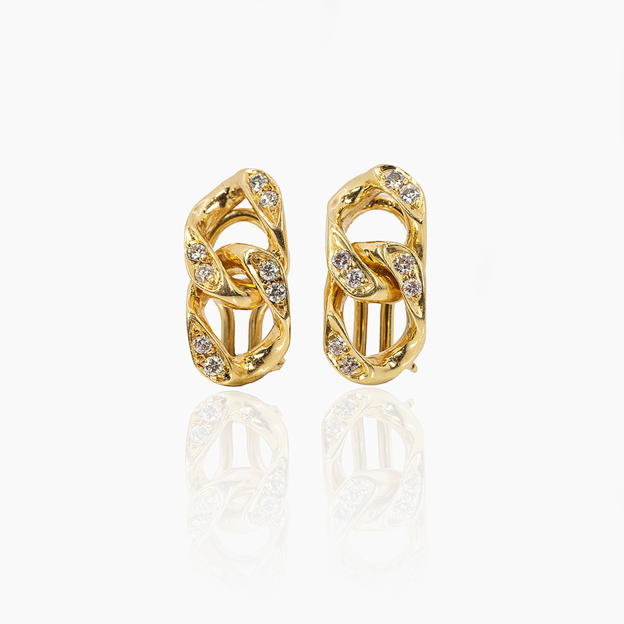 Orecchini a clip in oro dal design sofisticato, con doppia maglia intrecciata e un peso complessivo di 8,8 g. I diamanti, per un totale di circa 0,32 ct, donano luce e raffinatezza a un gioiello dallo stile deciso e senza tempo.