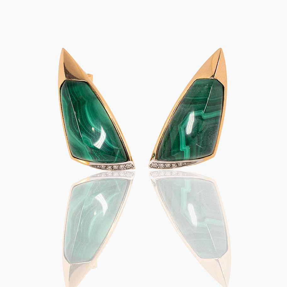 Il centro dell’orecchino è impreziosito da una decorazione in malachite naturale, resa ancora più profonda e luminosa grazie ad uno strato di resina trasparente, che ne esalta le venature verdi in un gioco di riflessi sofisticato.